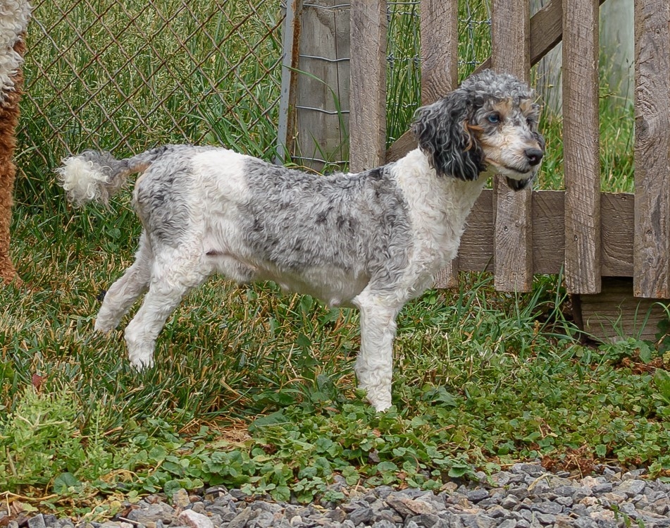 Addy is a 15 pound ACA registered mini poodle. She is blue merle, with striking tan points! She is the life of the parti, always on the go, and lots of fun! She loves people and other dogs as well.