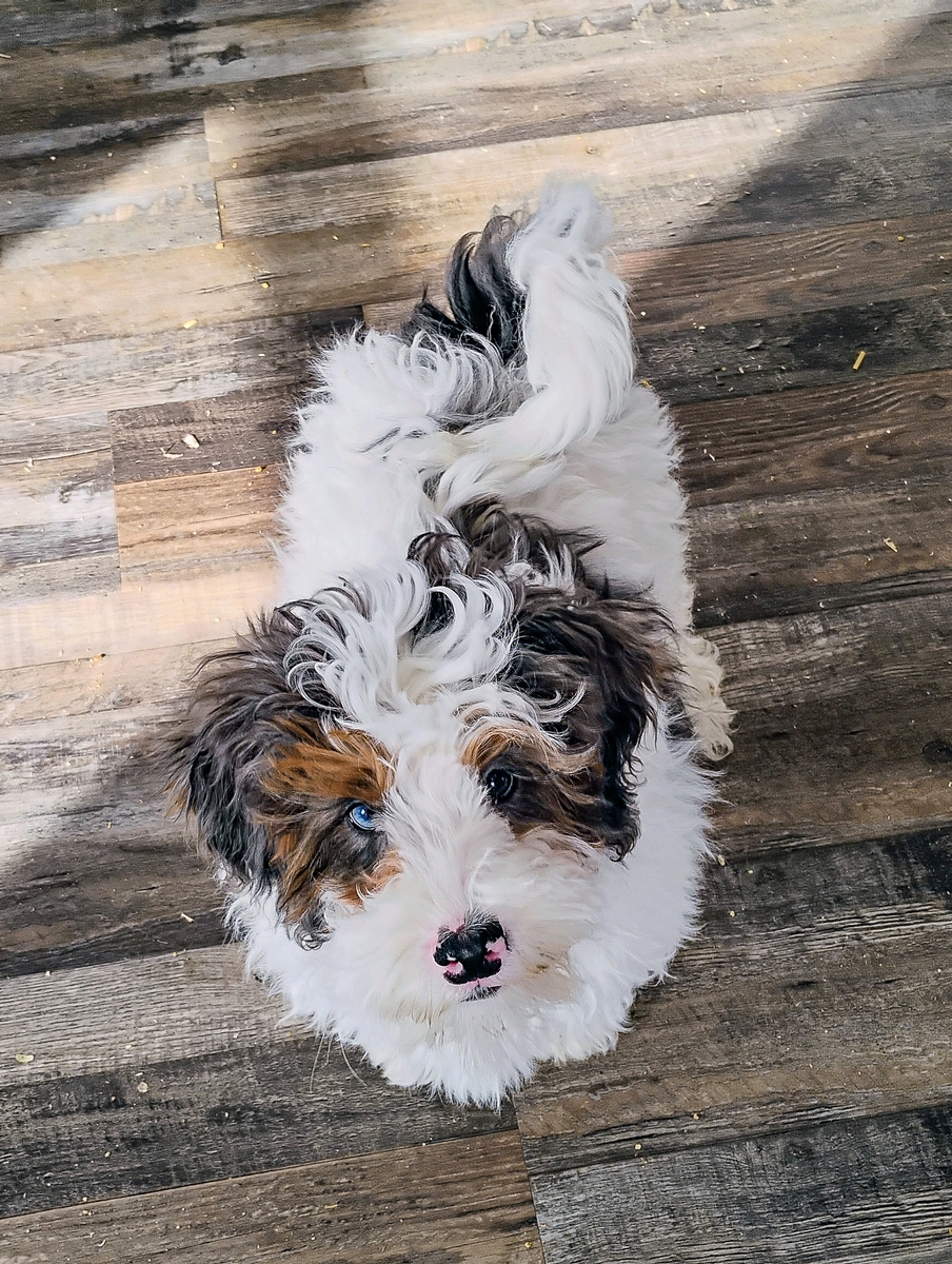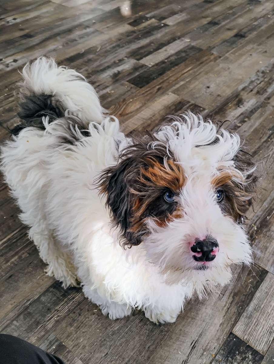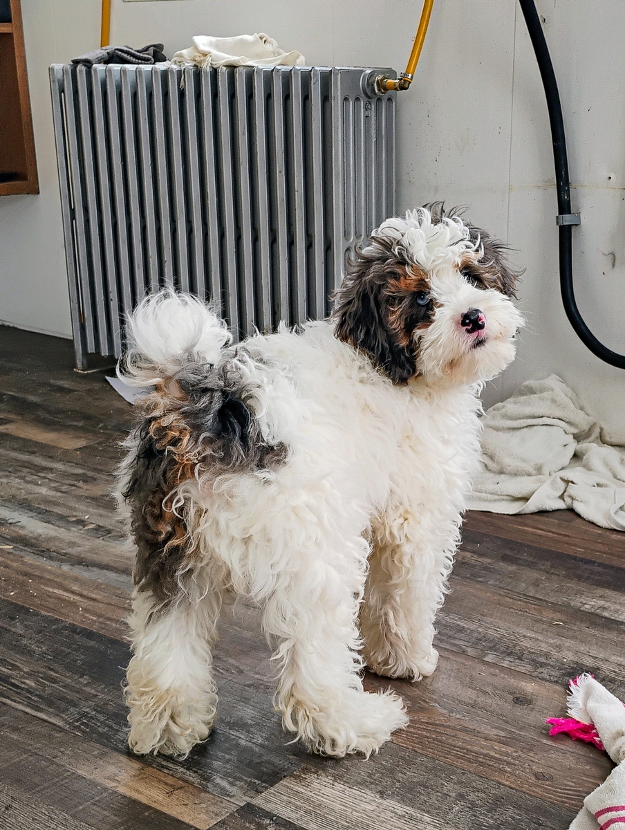 Pup-Date! 12/23/25 - Today Alex had his nails trimmed and had his fur brushed out nicely. He also had some one on one playtime. We put a harness on him and took him on a walk out in the snow for the first time! He also had some time in the crate today!
